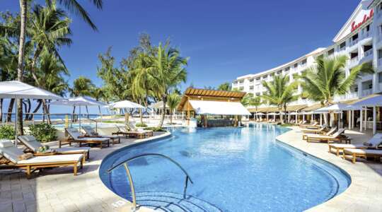 Flanked by powder-white sand and sparkling cerulean sea, this family-friendly resort boasts excellent facilities and a wide range of activities.