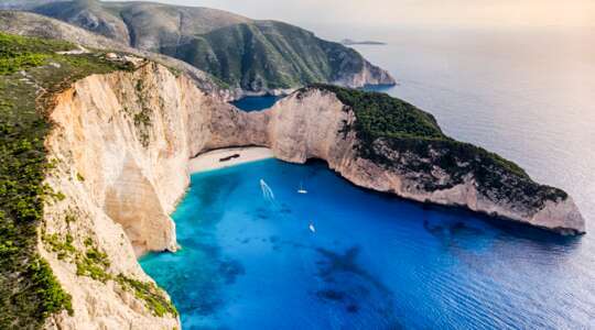 First, sail to Marathonisi, also known as Turtle Island, for a refreshing swim in its crystal-clear waters. Then, follow the stunning Keri coastline with its dramatic cliffs and breathtaking caves for a second swim stop in turquoise depths.